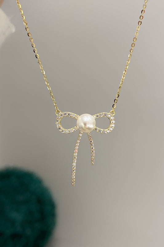 Tek İnci Detay Taşlı Kurdele Gümüş Kolye