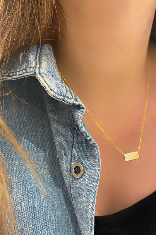 Yarısı Taş Detay Mini Dikdörtgen Gümüş Kolye