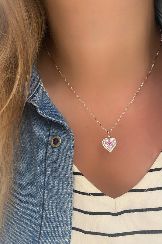 Beyaz Ve Ruby Taşlı Kalp Gümüş Kolye