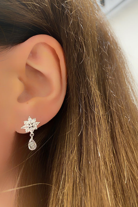 Damla Sallantılı Parıltılı Çiçek Gümüş Çivili Küpe