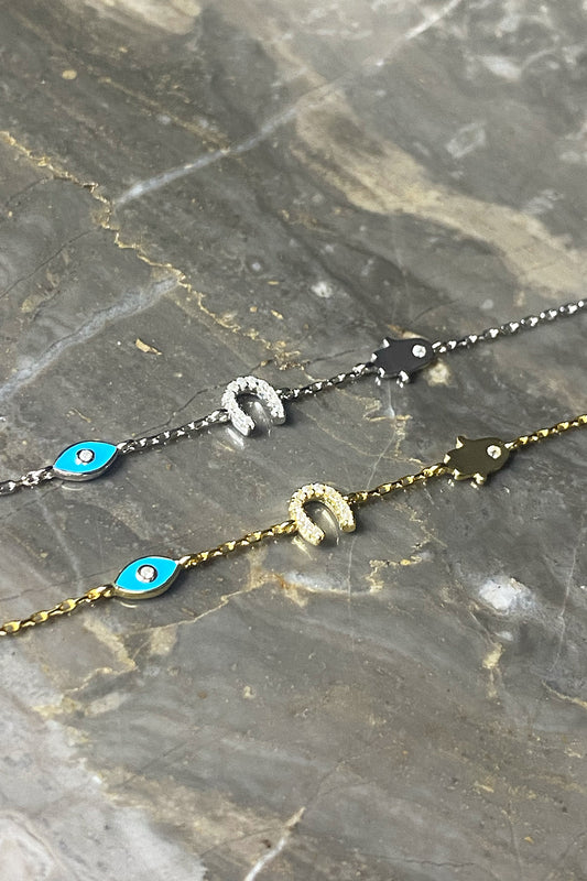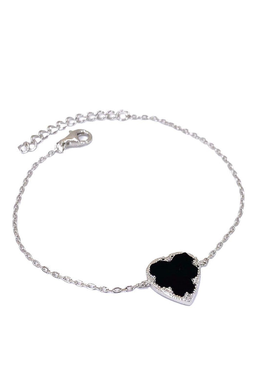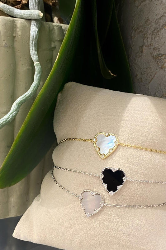 Etrafı Mini Baget Detay Siyah Sedef Kalp Gümüş Bileklik