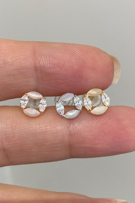 İki Beyaz Bir Yeşil Yuvarlak Gümüş Çivili Küpe