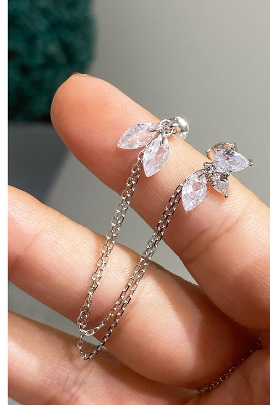 İki İnci Zincir Sallantılı Gümüş Çivili Küpe