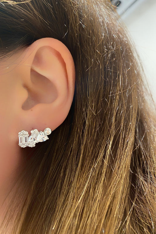Kalp Damla Ve Baget Parıltılı Gümüş Çivili Küpe