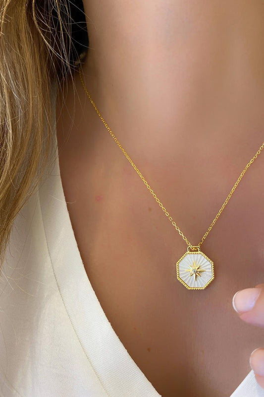 Kutupyıldızı Detay Tırtıklı Sedef Altıgen Gümüş Kolye