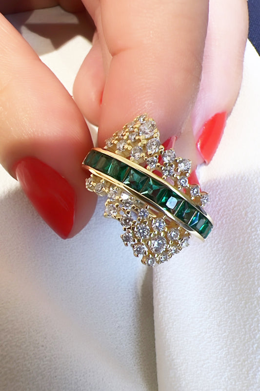 Ortası Zümrüt Detay Dağınık Beyaz Taşlı Gümüş Yüzük