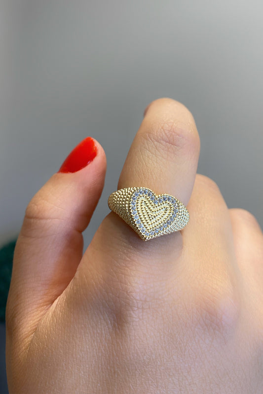 Mini Top Ve Taş Detay Kalp Gümüş Yüzük