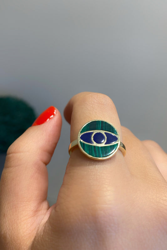 Malahit Ve Lapis Göz Yuvarlak Gümüş Yüzük