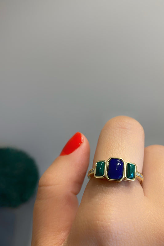 Malahit Ve Lapis Üç Geometrik Taş Yarım Tur Gümüş Yüzük