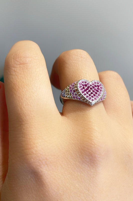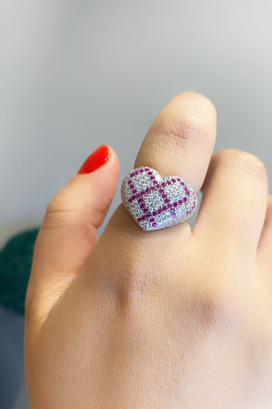 Ruby Ve Beyaz Baklava Taşlı Kalp Gümüş Yüzük