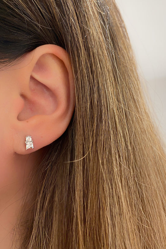 Mini İki Kare Taş Gümüş Çivili Küpe