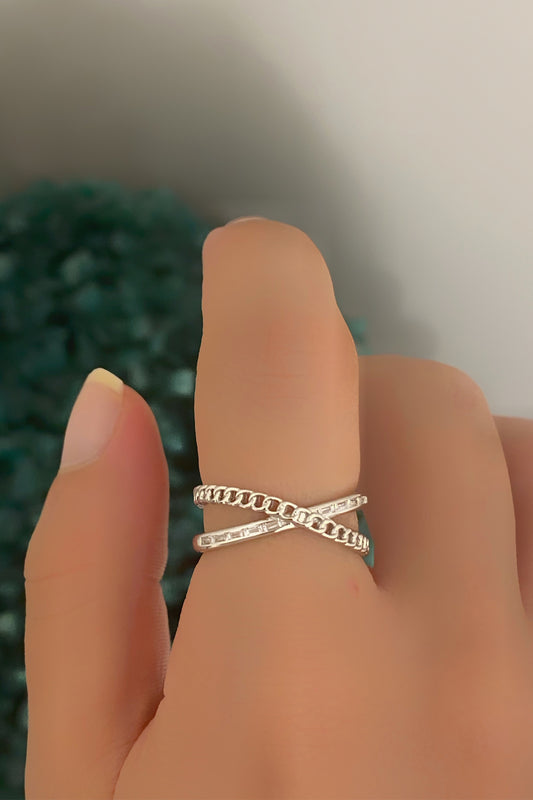 Gömülü Baget Ve Zincir Çapraz Gümüş Yüzük