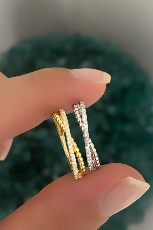 Top Ve Taşlı Çapraz İnce Gümüş Yüzük