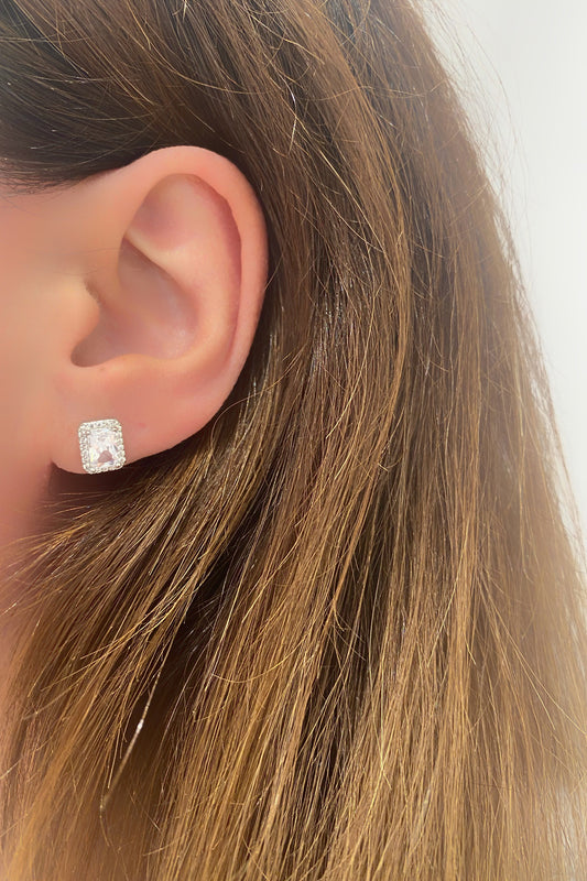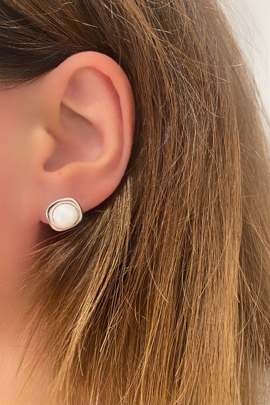İnci Ve Kare Çerçeve Gümüş Çivili Küpe