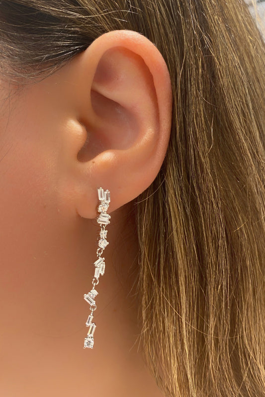 Dağınık Baget ve Taş Detay Sallantılı Gümüş Çivili Küpe