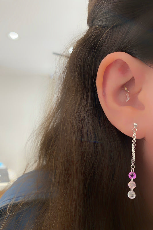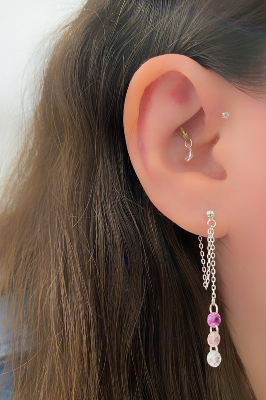 Ruby Beyaz Üç Taş Sallantılı Gümüş Çivili Küpe
