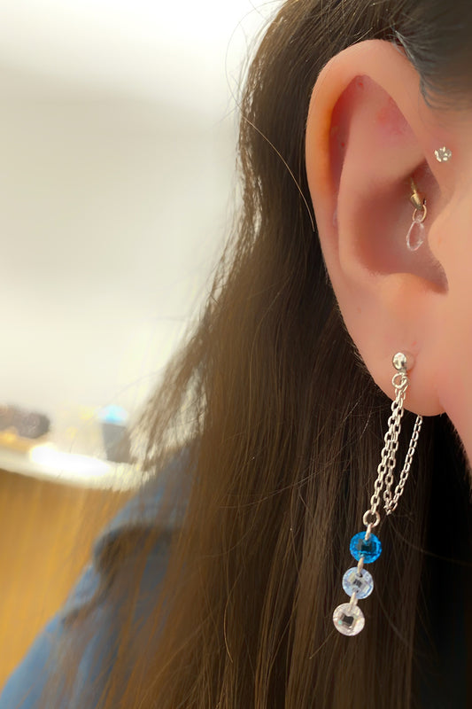Turkuaz Beyaz Üç Taş Sallantılı Gümüş Çivili Küpe