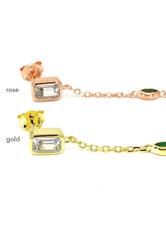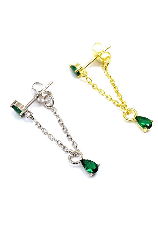 Yeşil İki Damla Gümüş Zincir Klips Küpe