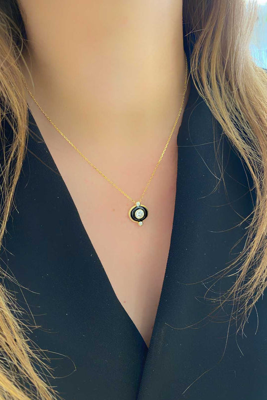 Üç Taş Detay Siyah Mineli Yuvarlak Gümüş Kolye