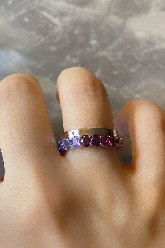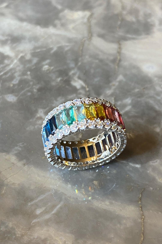 Rainbow Baget Ve Beyaz Sıralı Tamtur Gümüş Yüzük
