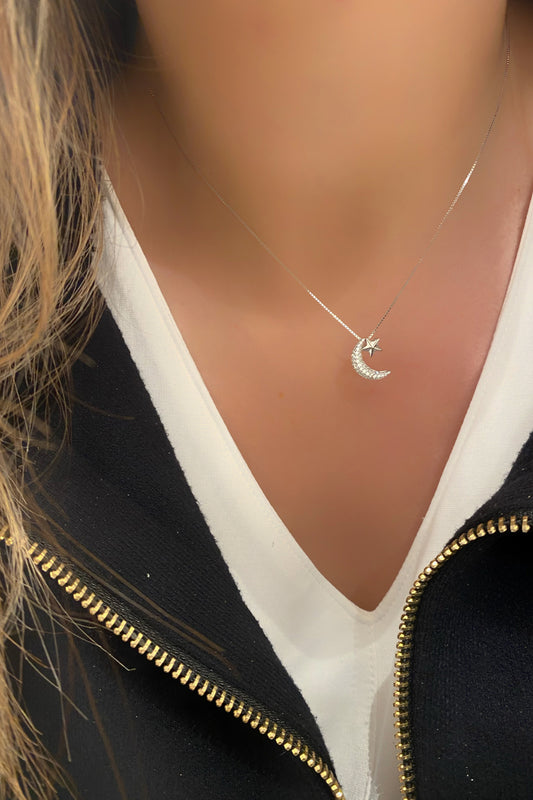 Taşlı Ay Ve Taşsız Yıldız Detay Gümüş Kolye