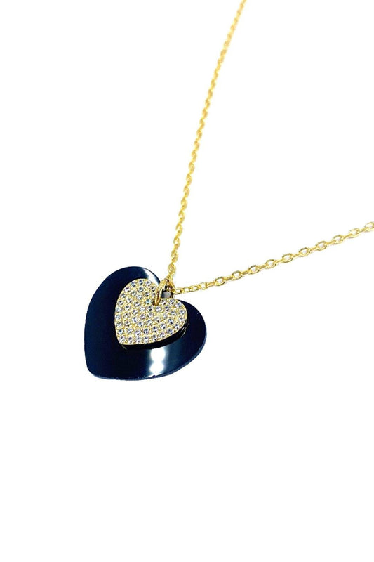 Siyah Ve Taşlı Kalp Gümüş Kolye
