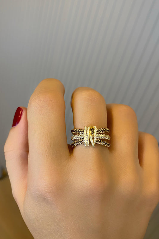 Sarı Ve Beyaz Taşlı Üç Sıra Düğüm Gümüş Yüzük