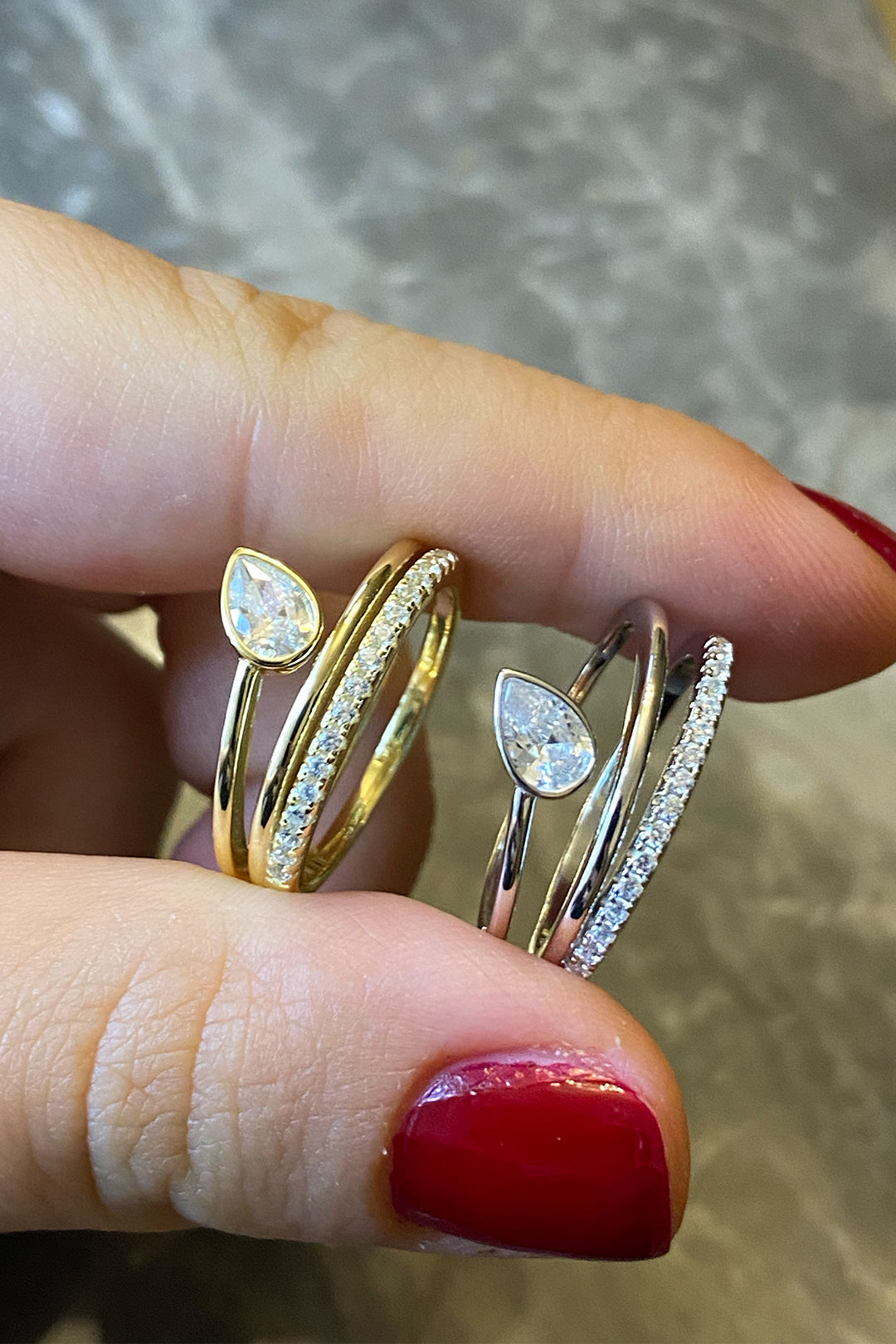 İki Sıra Taşlı Ve Taşsız Damla Detay Gümüş Yüzük