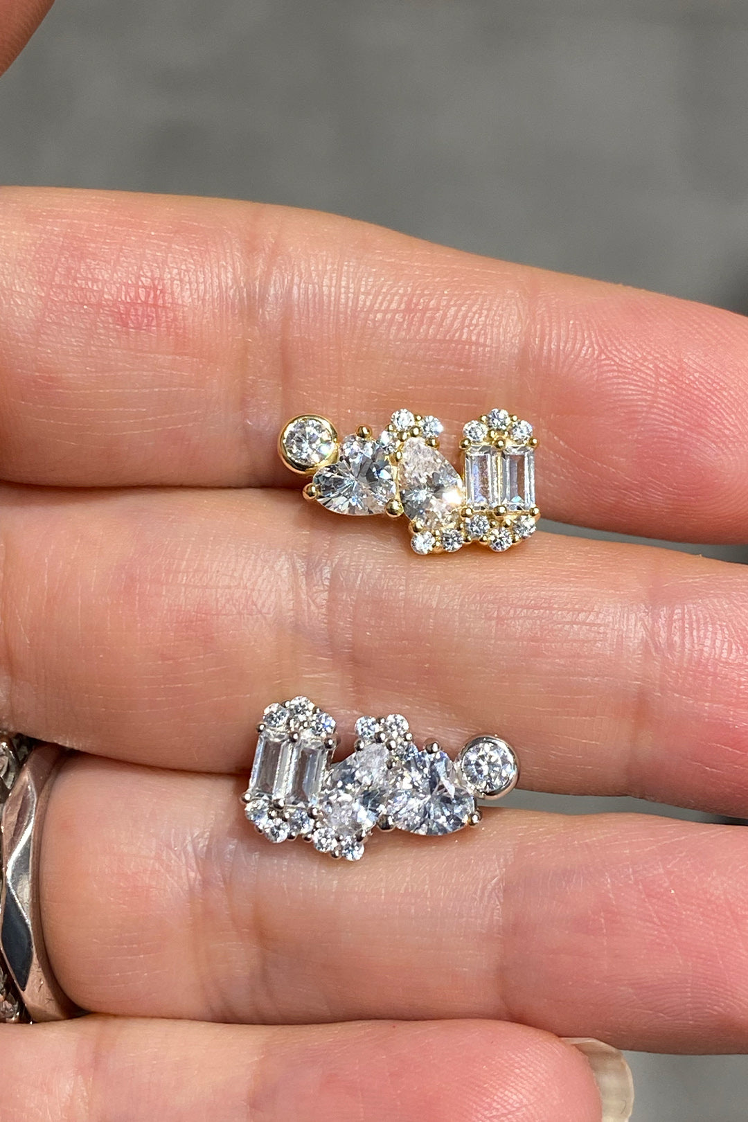 Kalp Damla Ve Baget Parıltılı Gümüş Çivili Küpe