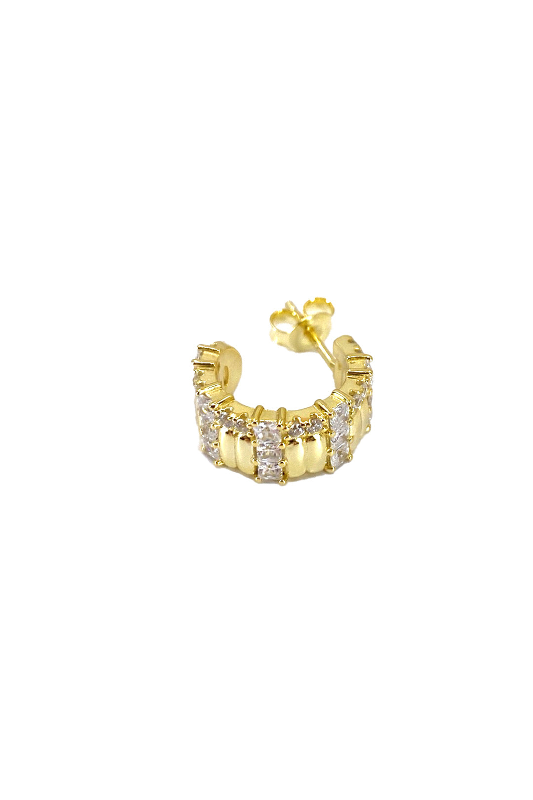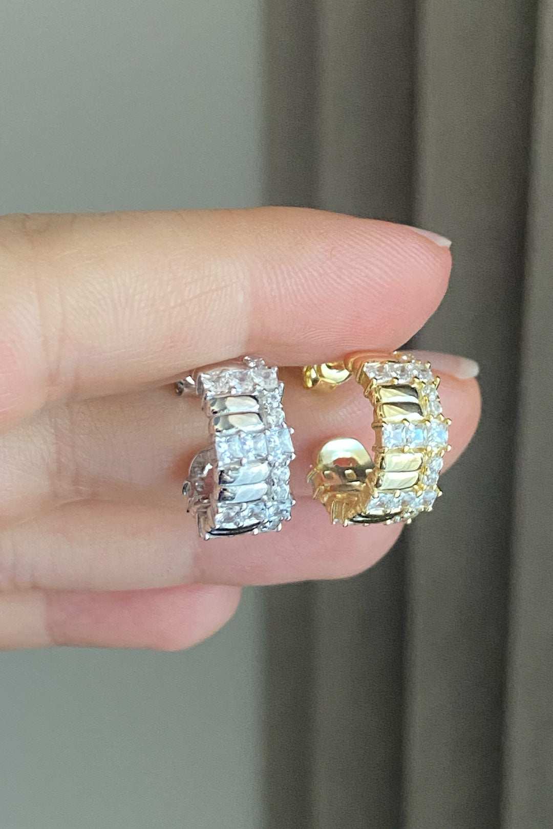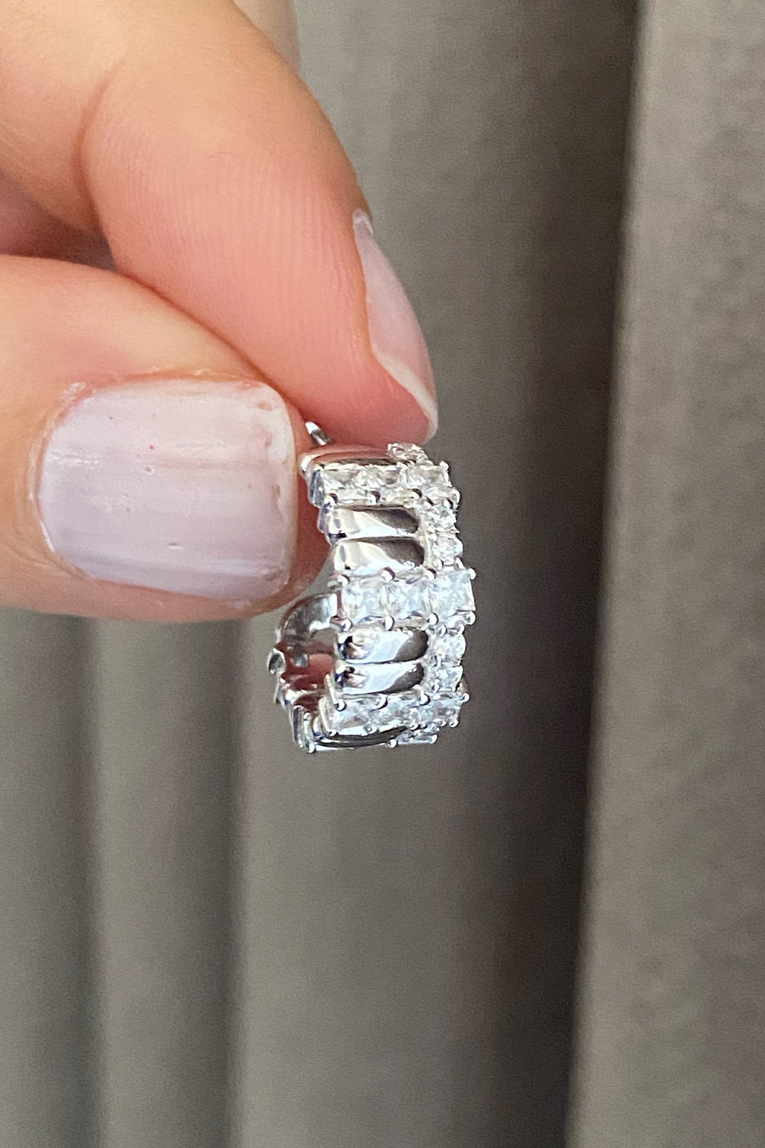 Kare Ve Yuvarlak Taş Detay Yatay Çizgili Gümüş Açık Halka Küpe