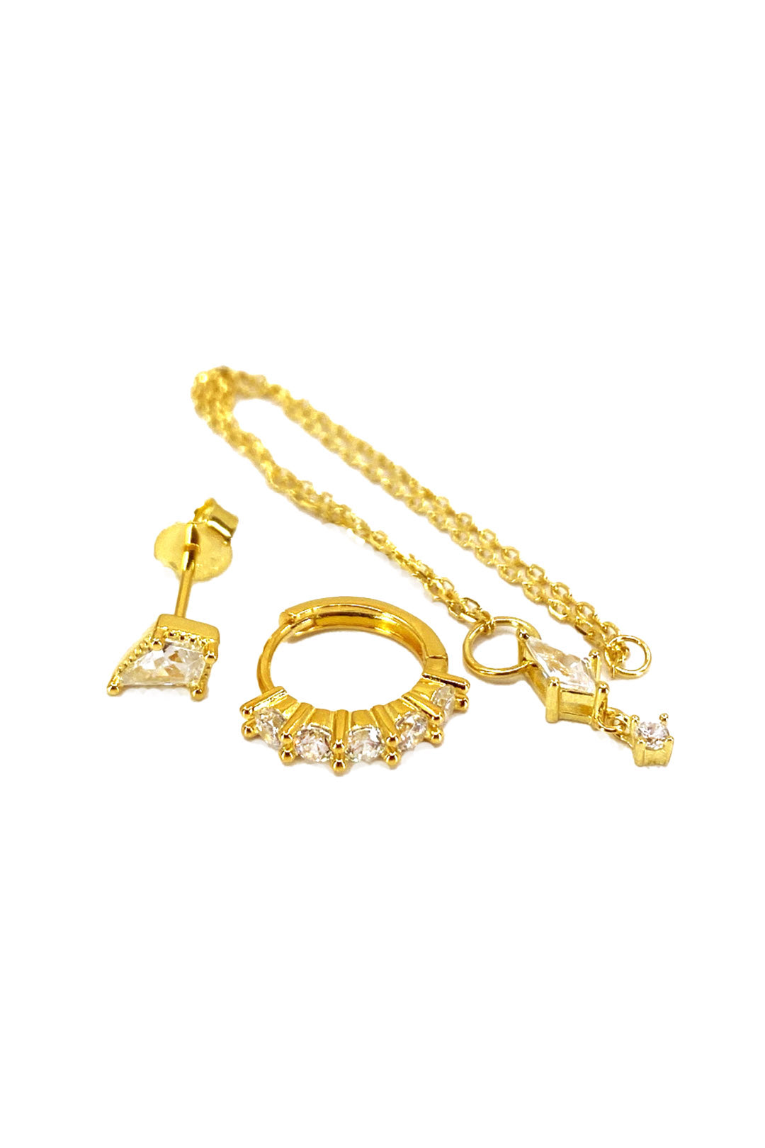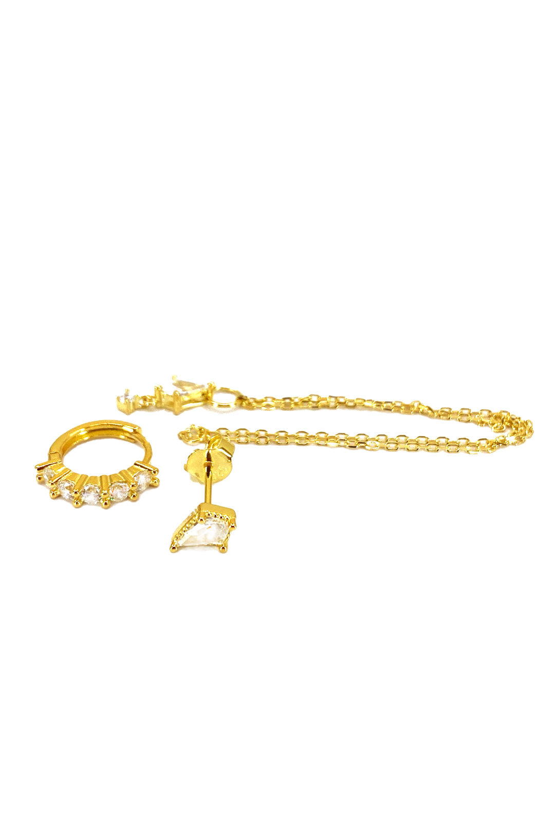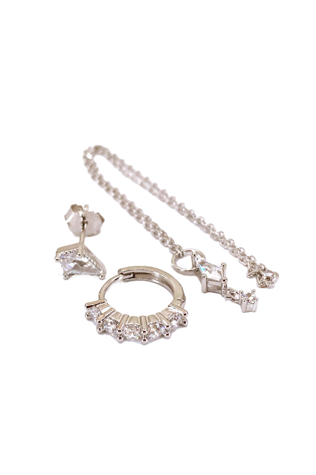 Karo Ve Taşlı Halka Gümüş İkili Küpe