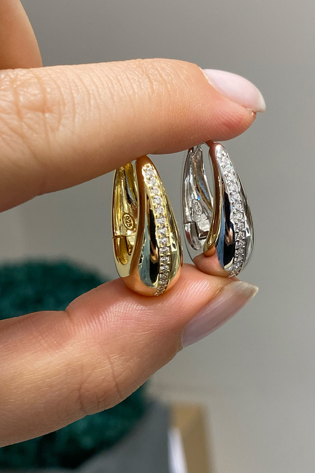 Ortası Dikey Taşlı Damla Gümüş Halka Küpe
