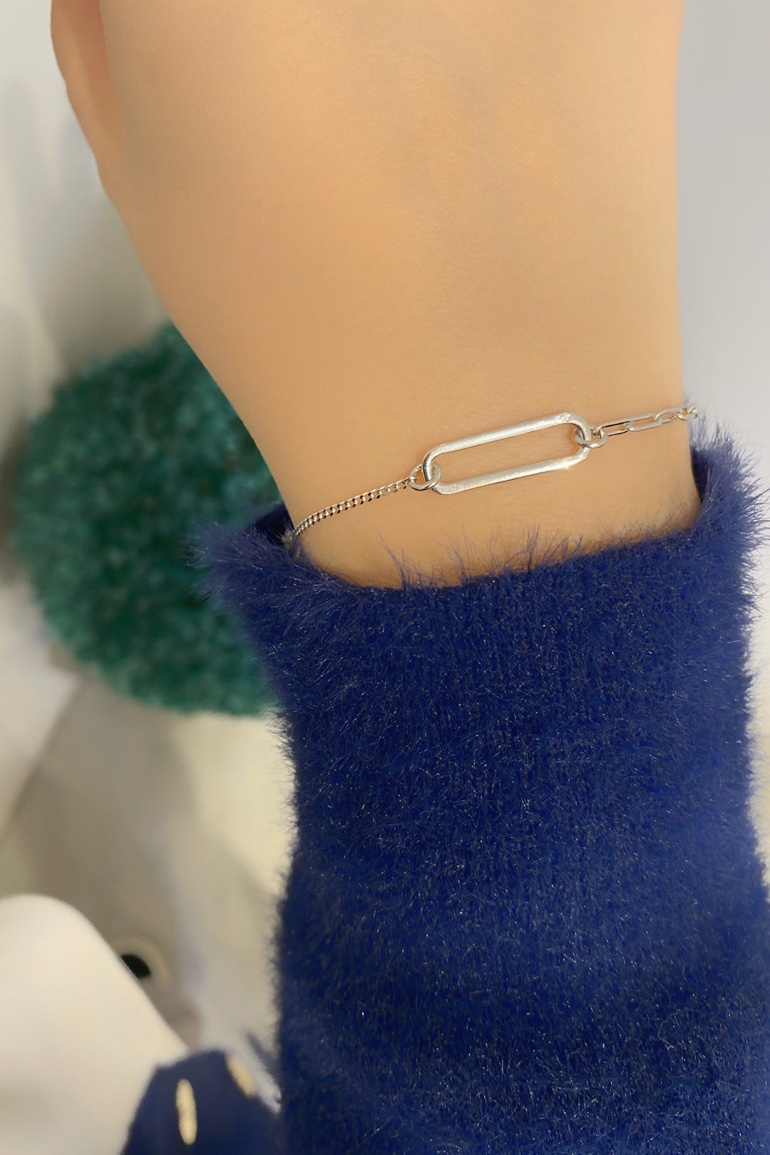 Oval Üstü Taş Detay Geo Zincir Gümüş Bileklik