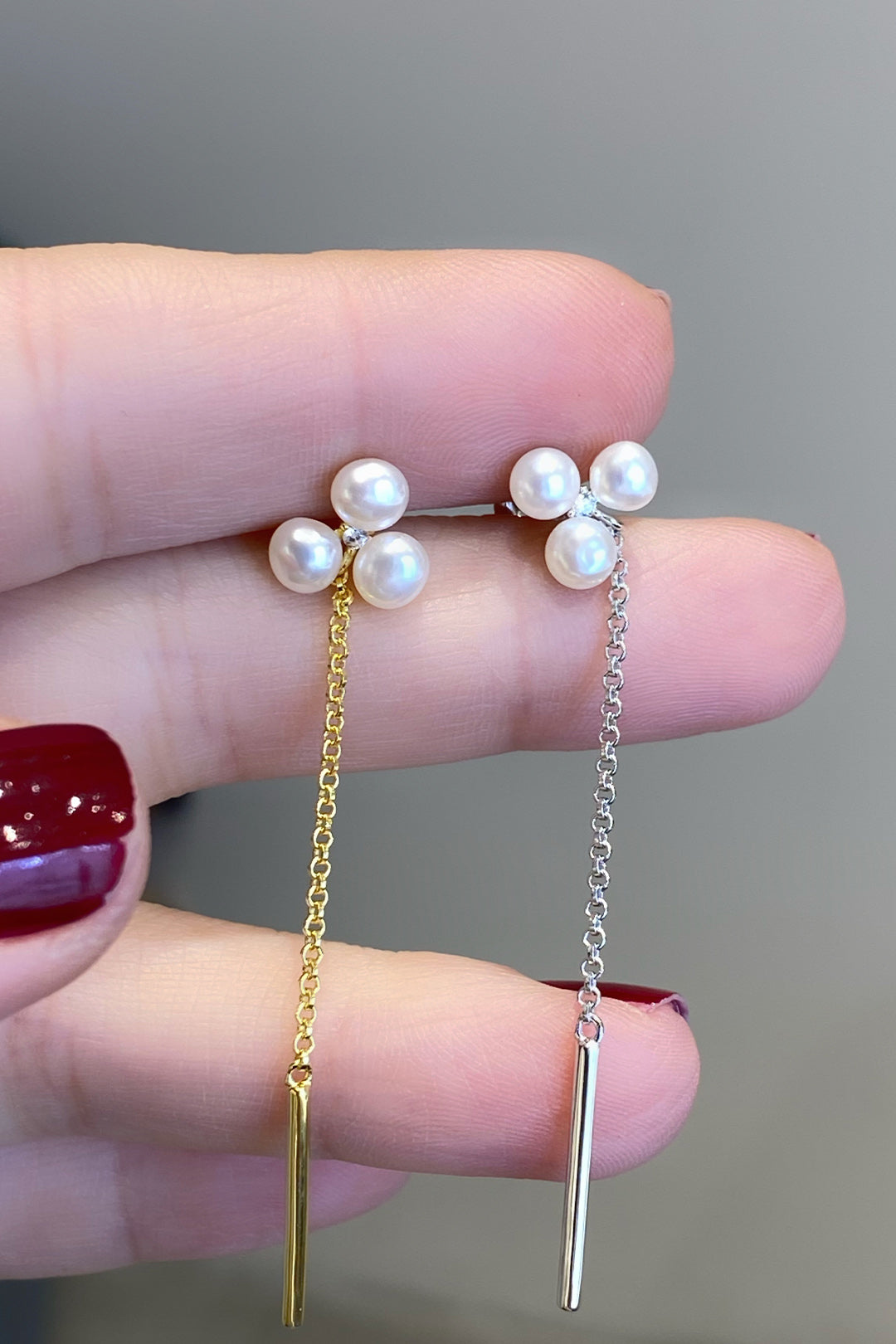 Üç İnci Üçgen Ve Çubuk Sallantılı Gümüş Çivili Küpe