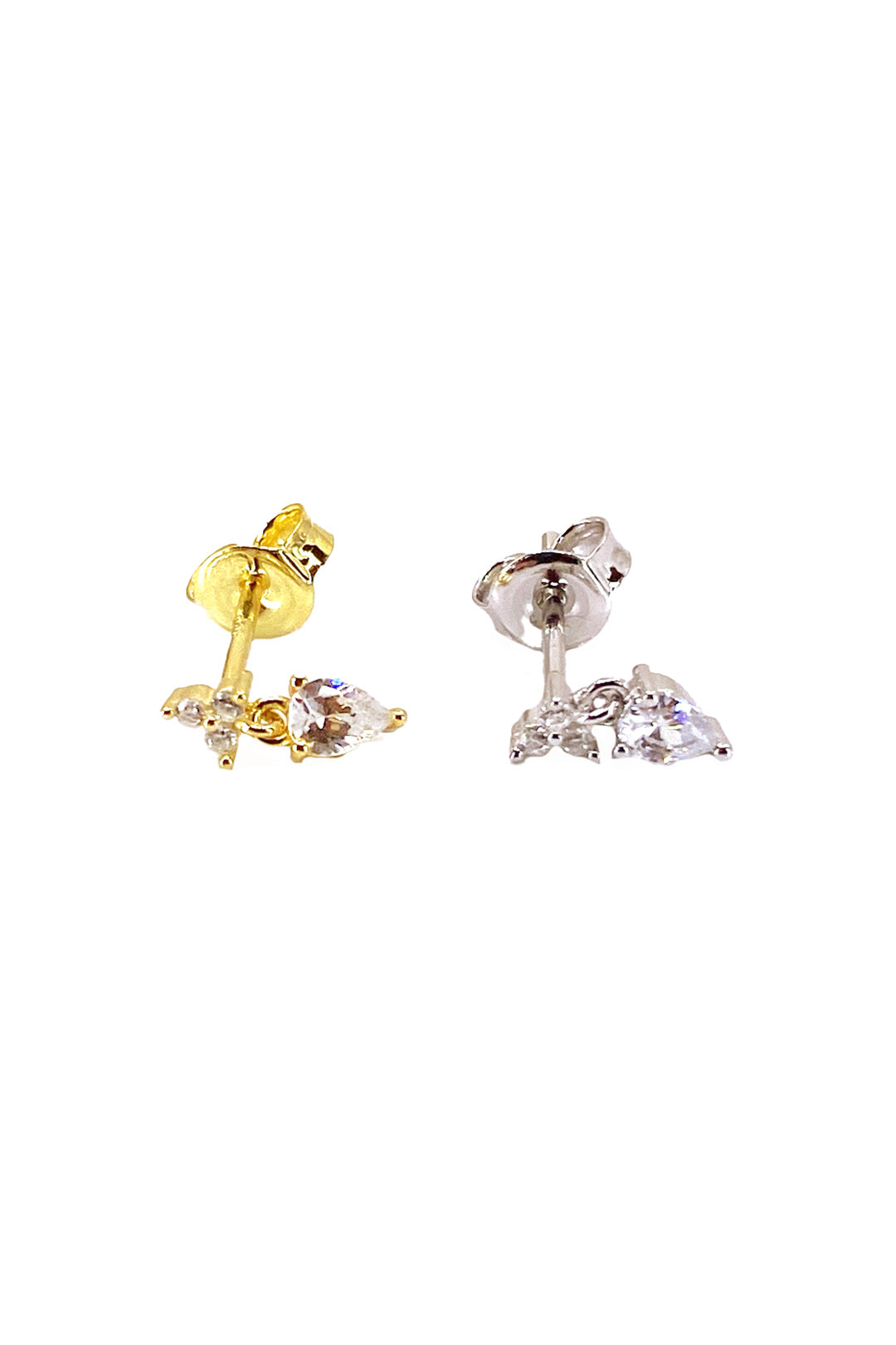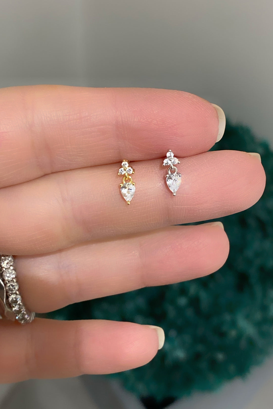 Üç Tektaş Üçgen Ve Damla Sallantılı Gümüş Çivili Küpe